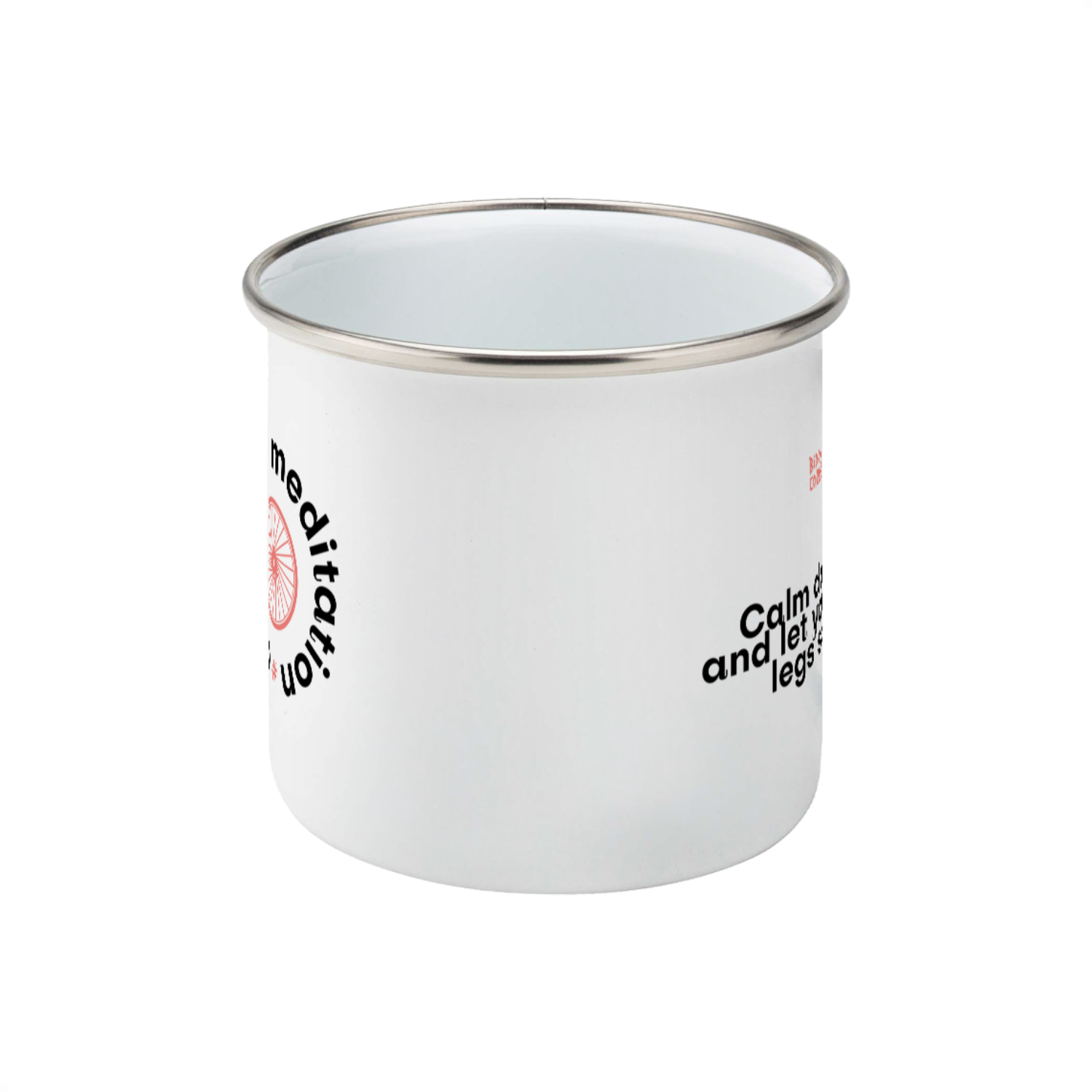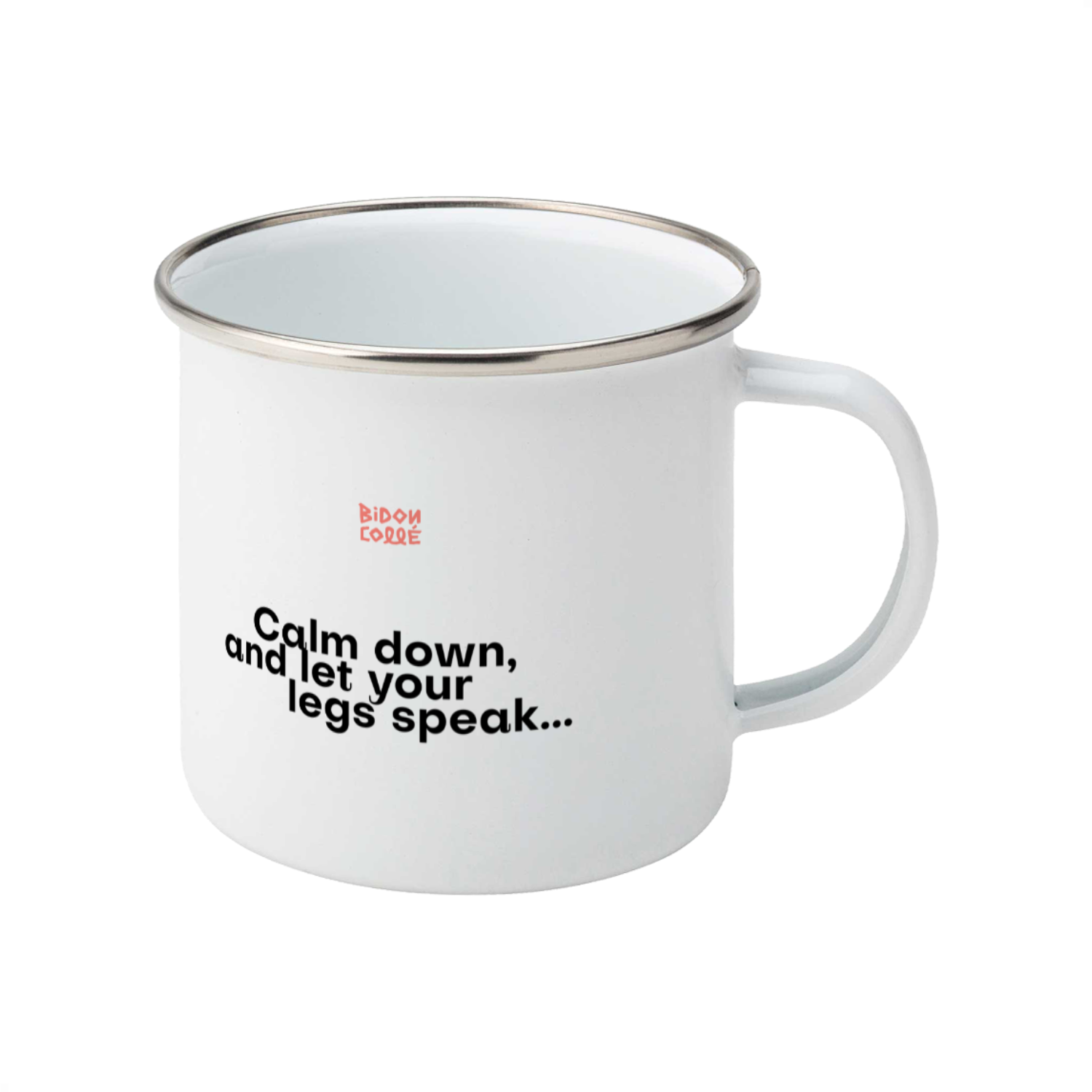 Calm down, and let your legs speak… Tinnen mok, die tegen een stootje kan. Ideaal om mee te nemen tijdens een biketrip.